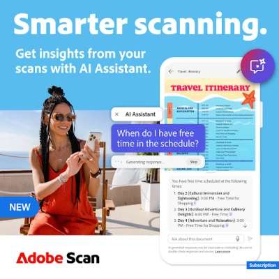 New: Adobe Scan now includes AI Assistant that helps turn scans into insights. Get instant answers and key details from your scans and then use them to draft emails, reports, or next steps. All in one app.